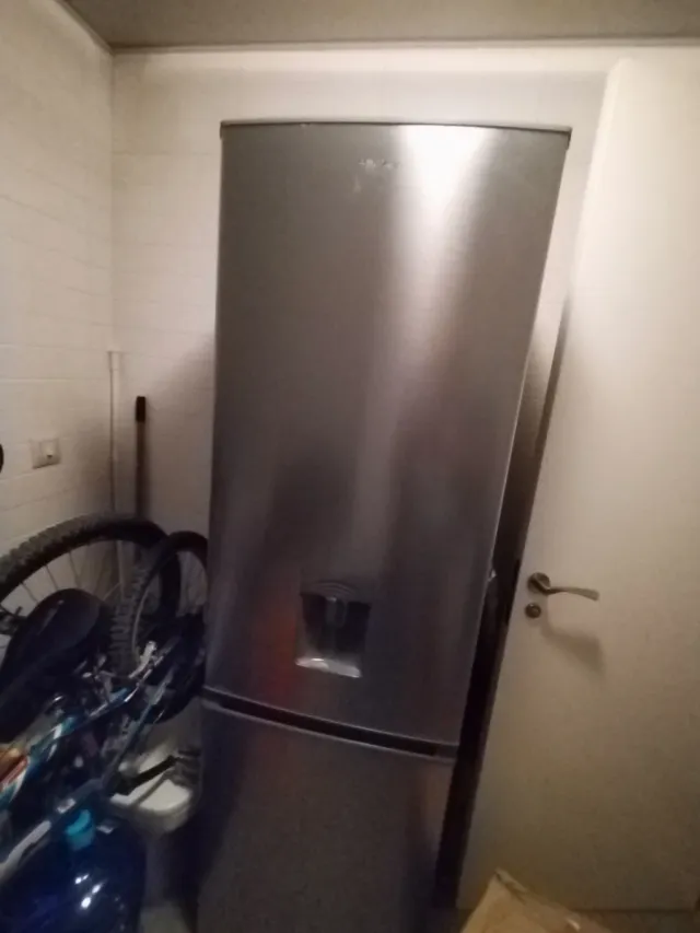 Nevera y congelador de color plateado. - Dispensador de agua integrado.