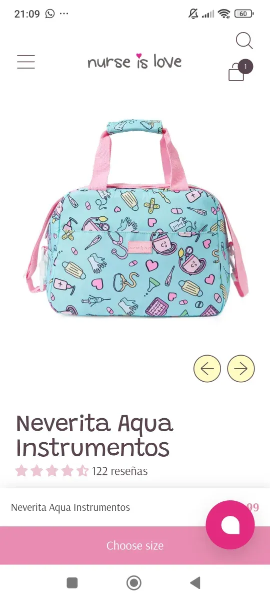 Bolso estampado con motivos sanitarios de la marca Nurse is Love. - Color: azul claro con estampado. - Asas: color rosa. - Cierre: cremallera.
