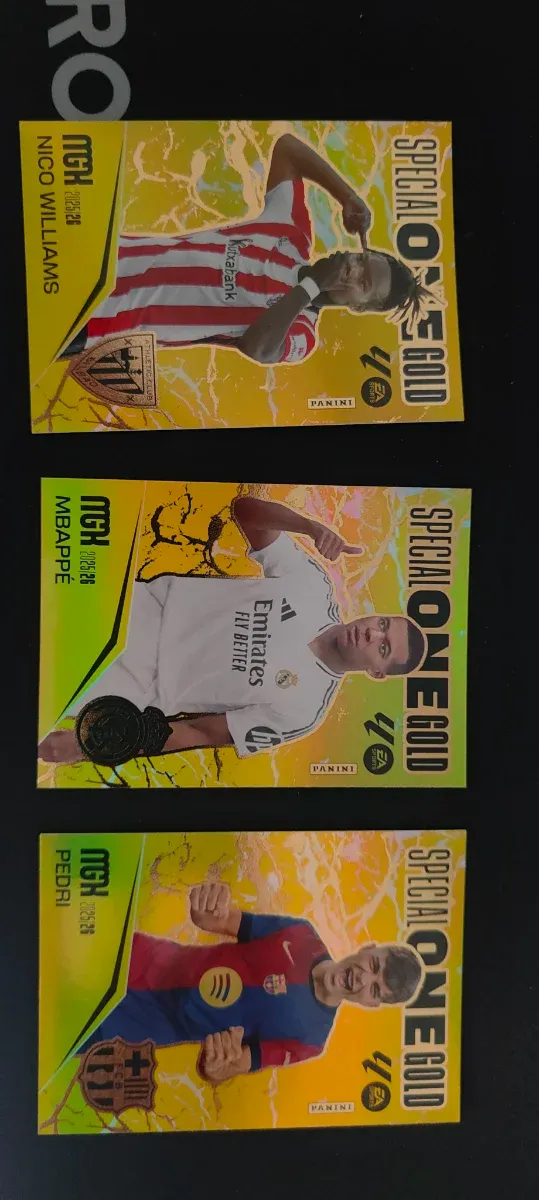 Detalles del productoLote de tres cartas de fútbol Special One Gold de los jugadores Nico Williams, Mbappé y Pedri.