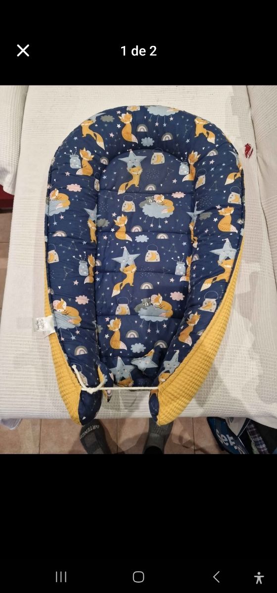 Detalles del productoCuna nido para bebé con un bonito estampado de zorros, estrellas y nubes. El exterior es de un suave tejido amarillo.