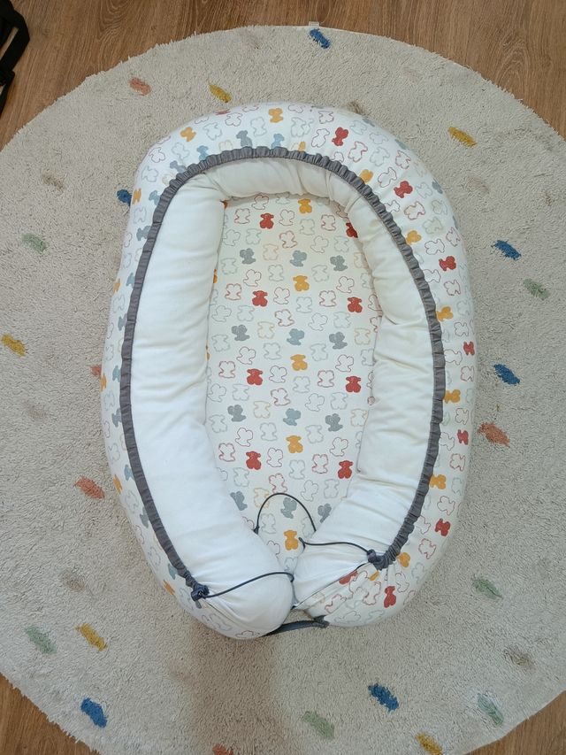 Nido de bebé, se puede utilizar para poner dentro de la cuna o encima del sofá y también para llevar de viaje. Tiene unas manchas en la parte superior derecha.
