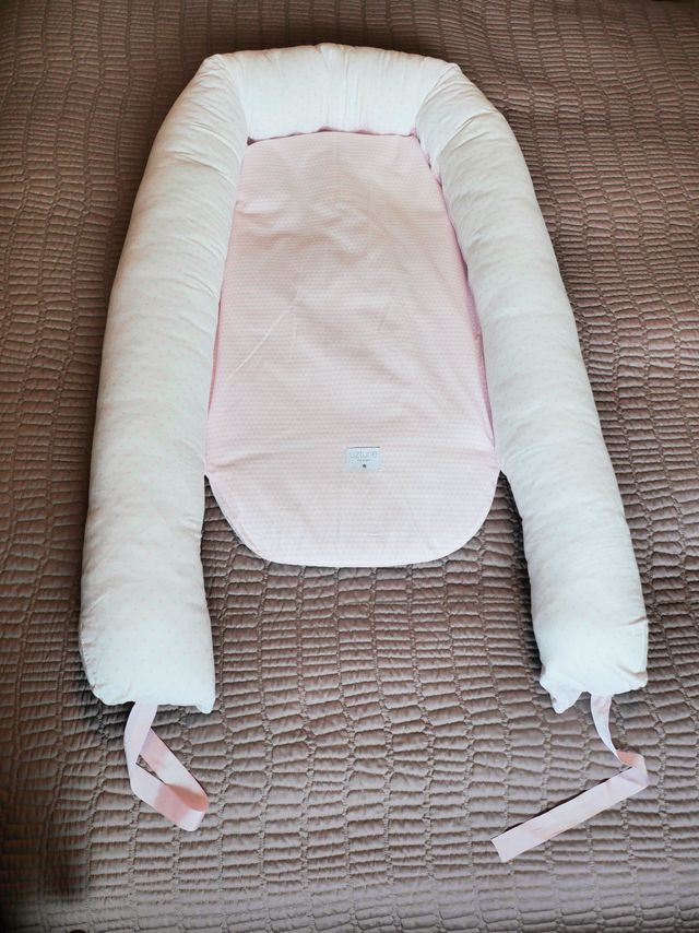 Cojín nido que se puede utilizar como un reductor en la cuna, como un lugar seguro para jugar en el suelo junto al bebé o en una cuna de viaje. Evita corrientes de aire.