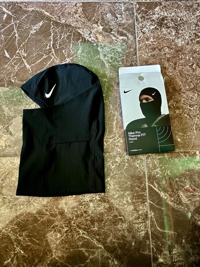 Máscara de esquí Nike Pro Therma-FIT en color negro. - Diseño de capucha. - Logo de Nike en blanco.