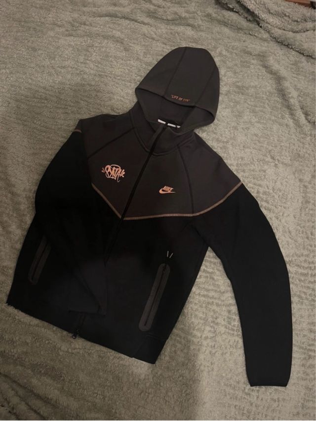 Sudadera Nike Tech Fleece con capucha y cremallera completa, en color negro y gris. Presenta un diseño moderno con detalles distintivos.