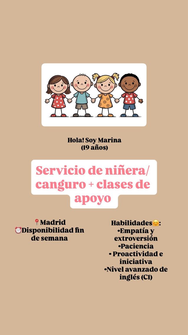 Detalles del productoHola! Me llamo Marina, tengo 19 años y estudio la carrera de Estudios Internacionales. Me ofrezco como niñera los fines de semana en Madrid ciudad.