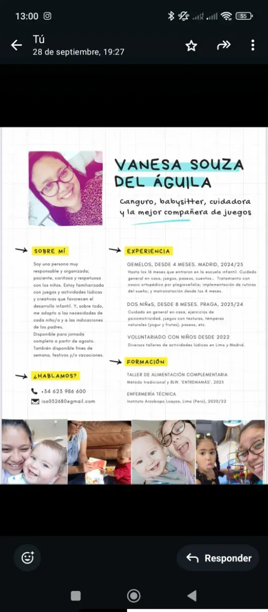 Detalles del productoNiñera con amplia experiencia en cuidado de bebés y niños/as de 0 a 12 años, incluido gemelos. Familiarizada con juegos y actividades lúdicas y creativas que favorecen el desarrollo infantil. Soy una persona muy responsable y organizada; también soy paciente, cariñosa y respetuosa con los niños. Por supuesto, me adapto a las necesidades de cada niño/a y a las indicaciones de los padres y, para su tranquilidad, tengo conocimientos de primeros auxilios y enfermería. Disponible para días y horarios flexibles