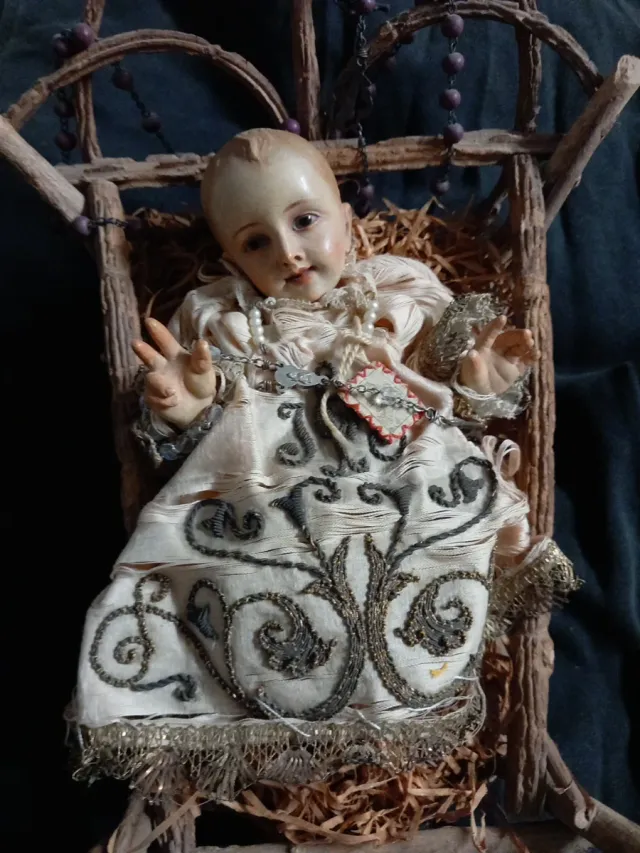 Detalles del productoPrecioso Niño Jesús con un ropaje muy antiguo. Una pieza delicada y llena de historia.