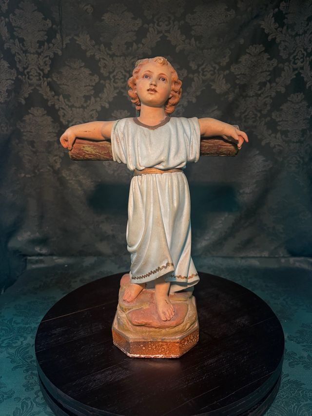 Detalles del productoFigura del Niño Jesús de Pasión, obra de Olot. Representa al niño con los brazos extendidos sobre un madero.