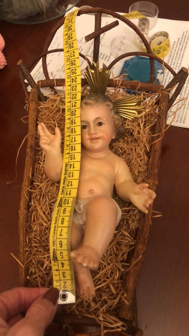 Detalles del productoFigura del Niño Jesús acostado en una cuna de madera con paja.