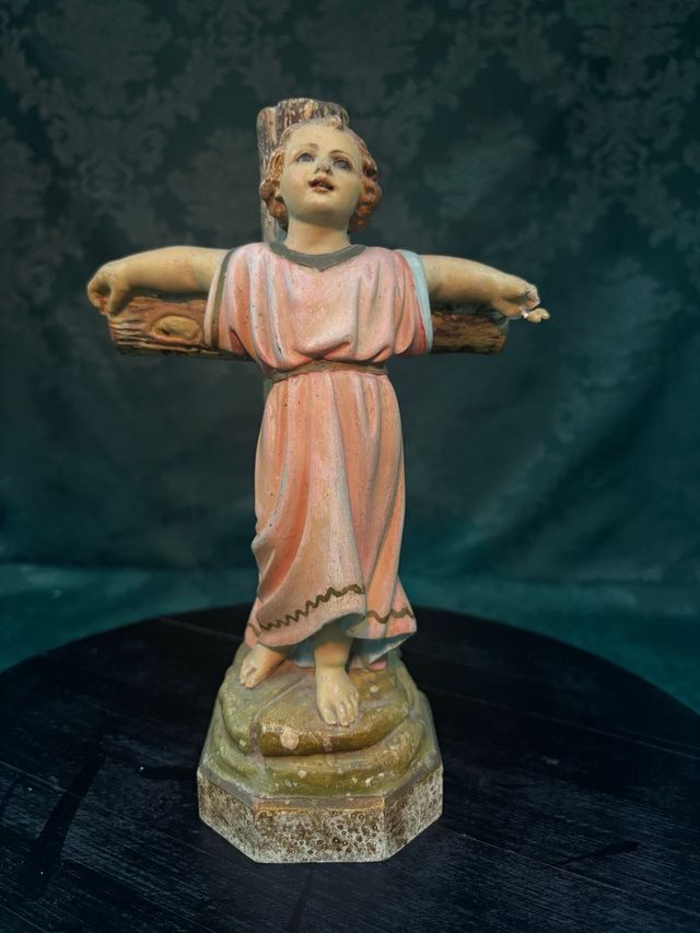 Detalles del productoFigura religiosa del Niño Jesús de Pasión, obra de Olot. Representa al niño con los brazos extendidos.