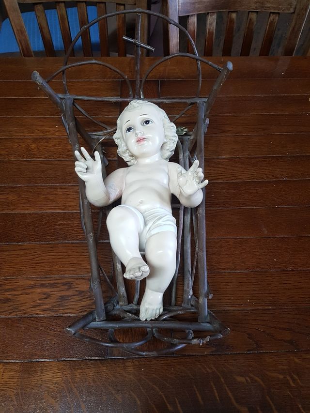 - Figura de niño Jesús en un pesebre artesanal.