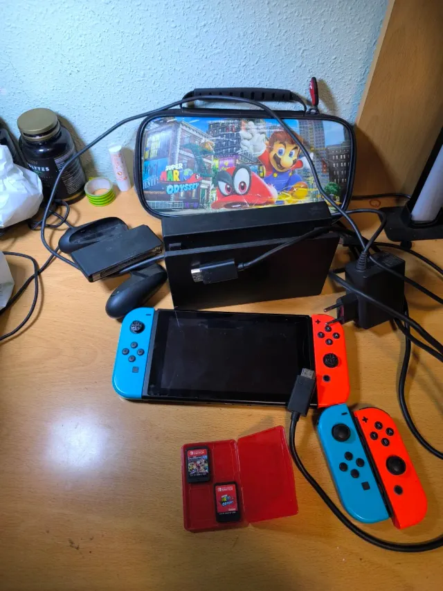 Detalles del productoConsola Nintendo Switch con accesorios y juegos.