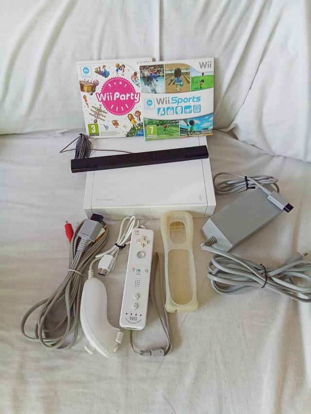 Detalles del productoConsola Nintendo Wii en perfecto estado, sin ninguna marca de uso. Se vende con un mando completo más una funda de silicona y dos juegos (Wii Sports y Wii Party) . Se vende por cambio de modelo.