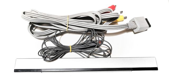 Barra sensor de Nintendo Wii con su cables de conexión AV. - Sensor Bar plateado. - Cable AV con conectores RCA (rojo, blanco, amarillo). - Cable de conexión para el sensor.
