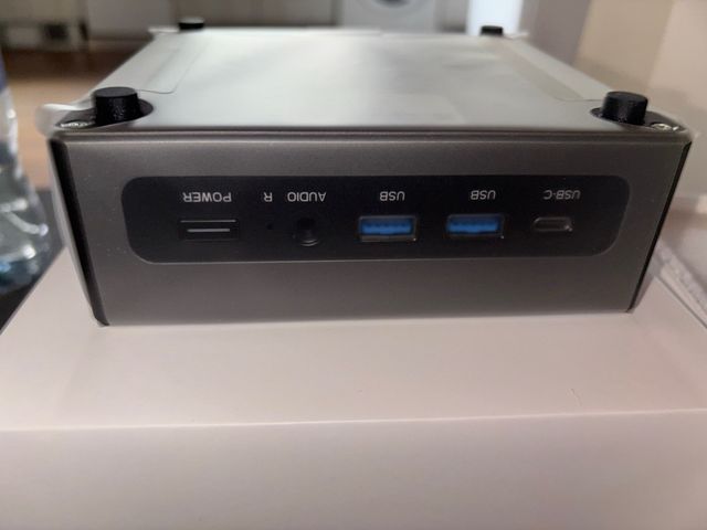Mini PC compacto y elegante con múltiples puertos para una conectividad versátil. - Puerto de alimentación. - Puerto de audio R. - Dos puertos USB. - Puerto USB-C.
