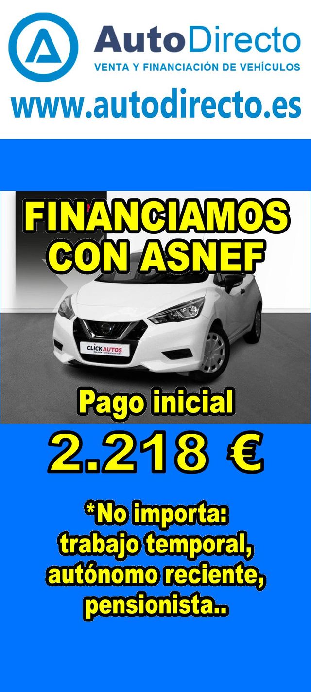 Detalles del producto¿No consigues financiación? ¡Tenemos la solución! *************************************************************************** RENT CREDIT: Aprobamos más del 90% de las operaciones. No importa ASNEF o RAI, impagos pendientes, ser autónomo o empresa reciente, ser pensionista. Imprescindible pago inicial del 20%. Ejemplo de operación: NISSAN MICRA 1.0 70CV ACENTA. Ref. W957208KLW - Precio vehículo financiado: 11090 €. - Pago inicial de 2218 €. - Cuota mes desde 236 €. - Impuesto de circulación y garantía (mínimo 1 año) incluidos. *************************************************************************** ✅ Más de 3.000 COCHES Y FURGONETAS EN STOCK. ✅ HASTA 2 AÑOS DE GARANTIA. ✅ Kilómetros certificados. ✅ 17 concesionarios repartidos en toda España. ♻️ Aceptamos tu coche como parte del pago. *************************************************************************** IMPORTANTE: -. Este anuncio, no es vinculante, puede contener errores. SE MUESTRAN A TÍTULO INFORMATIVO Y NO CONTRACTUAL. -. Consultar disponibilidad del vehículo y datos exactos: fecha de matriculación, importes, etc,... *************************************************************************** Te ofrecemos distintas opciones: financiación, renting, alquiler con opción a compra, rent credit. En nuestro stock disponible encontraras: 3008 , qashqai , corolla , rav4 , sandero , Duster , yaris , 2008 , Tucson , Ibiza , 208 , Sportage , a3 , c4 , Formentor , q3 , yaris cross , 500 , c3 , arona , zs , x1 , kona , corsa , clase a , león , 308 , serie 1 , golf , focus , captur , a1 , tiguan , i20 , t roc , stonic , xc40 , civic , q5 , serie 3 , glb , 5008 , ateca , clio , kuga , c hr , i30 , arkana , juke , a4 , x3 , cx 5 , xc60 , kamiq , taigo , Mustang , x6 , polo , ceed , karoq , x2 , Astra , niro , cx 30 , a5 , cooper , megane , moka , fiesta , hs , q2 , clase c , serie 3 , renegade , picanto.