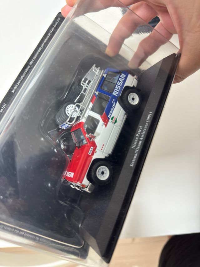 Réplica a escala 1/43 del Nissan Patrol Datsun Assistance de 1991. - Modelo de coleccionista. - Diseño bicolor rojo y blanco con detalles azules. - Incluye baca y rueda de repuesto.