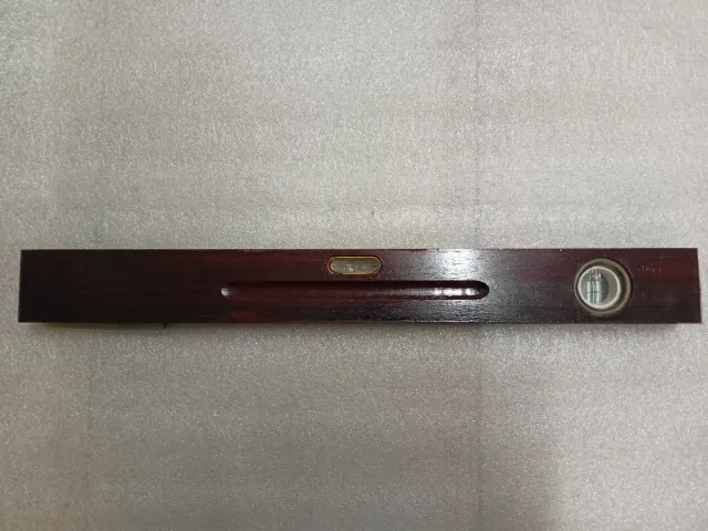 Nivel de burbuja de madera. -Antiguo sin usar. - Refuerzos metálicos en laterales y base. - Cuerpo de madera oscura. - 2 Burbujas de nivelación visible.