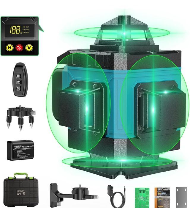 1x Nivel Láser 4D 16 Líneas, 1x Maletin, 1x Cargador de Corriente, 1x 1/4 «Tread Mount, 1x 5/8-20» Tread Mount, 1x Plancha de Pared, 1x Manual de Usuario, 1x Mando a Distancia, 1x Placa de Puntería Verde, 1x Soporte de Pared, 1x Plataforma Elevadora, 2x Baterías 2400mAH.