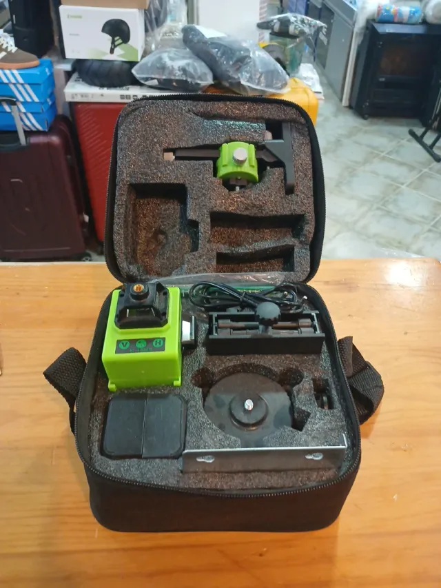 Detalles del productoNivel láser 4D en color verde, ideal para trabajos de precisión. Se presenta en su maletín original para un fácil transporte y almacenamiento.