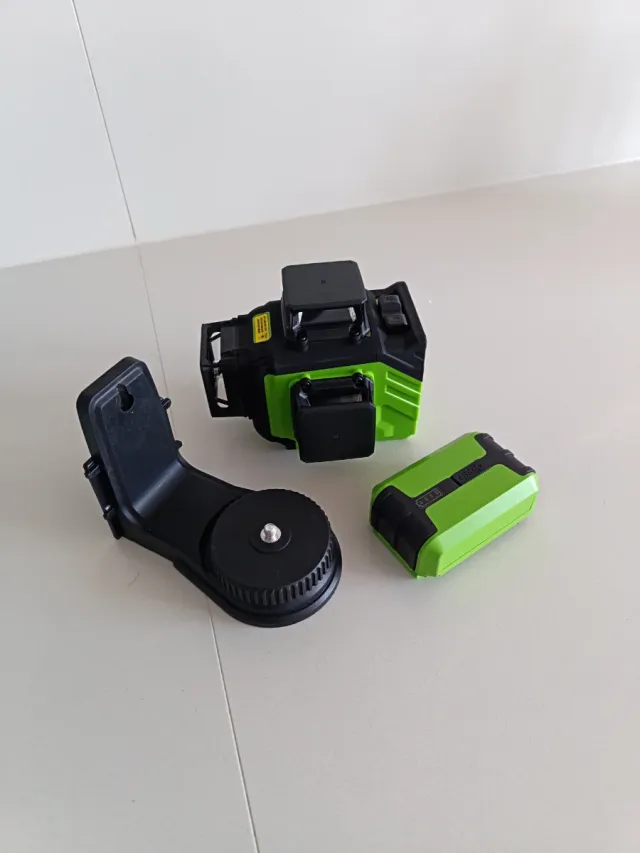 Nivel láser autonivelante con batería recargable 360 multifunción luz verde. - Incluye soporte. - Batería de color verde y negro. - Funda trasporte