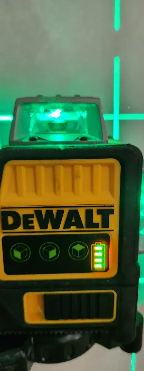 Nivel láser DeWalt con líneas verdes. Ideal para trabajos de construcción y bricolaje. - Indicador de batería. - Diseño compacto y robusto.