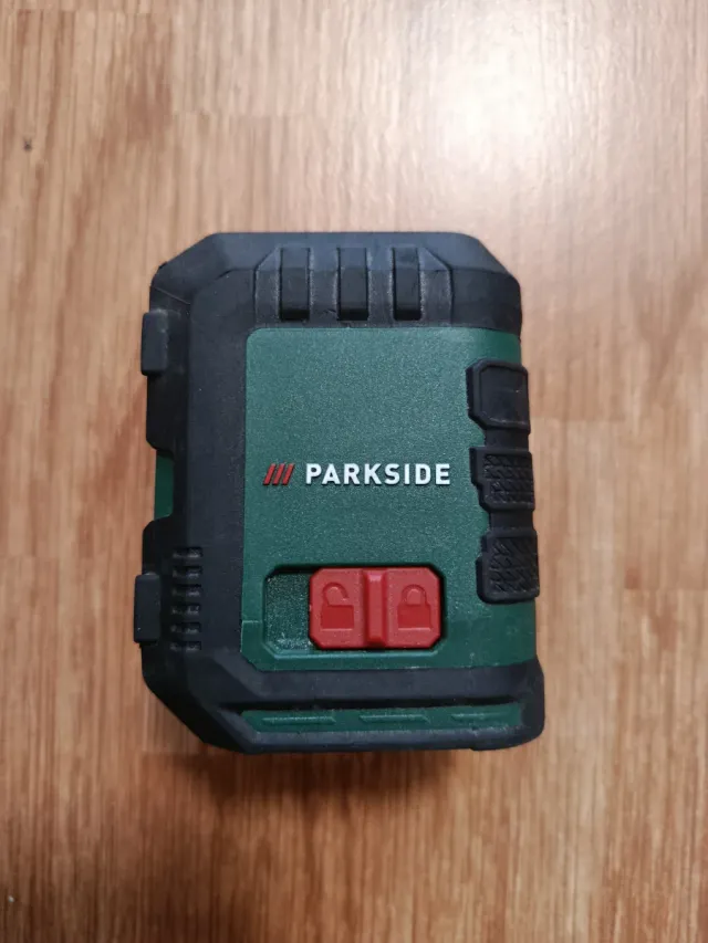 Nivel láser de la marca Parkside, con un diseño robusto y compacto. Con 🔋 🪫 - Carcasa de plástico y goma. - Botones de control en color rojo.