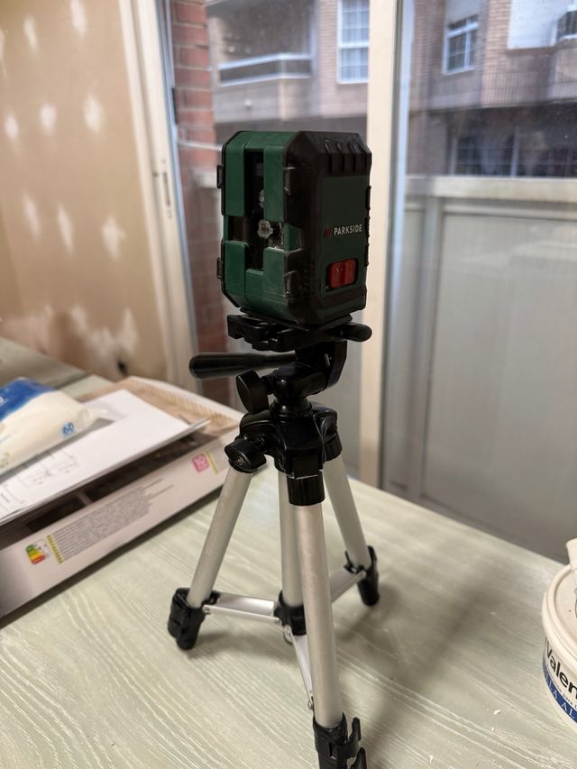 Nivel láser de la marca Parkside, ideal para trabajos de medición. - Color verde y negro. - Incluye trípode. - Botones rojos de encendido/apagado.