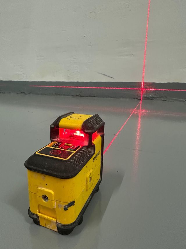 Nivel láser de la marca Stanley. Proyecta líneas rojas para mediciones. - Diseño compacto y robusto. - Ideal para trabajos de construcción y bricolaje.