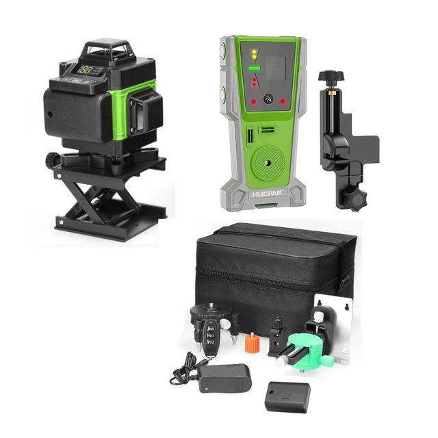 Contenido: Nivel laser 360°, 2 baterías recargables, base giratoria 360°, soporte pared o techo con placa, alzador de suelo, mando a distancia, cargador, bolsa acolchada de transporte y detector.