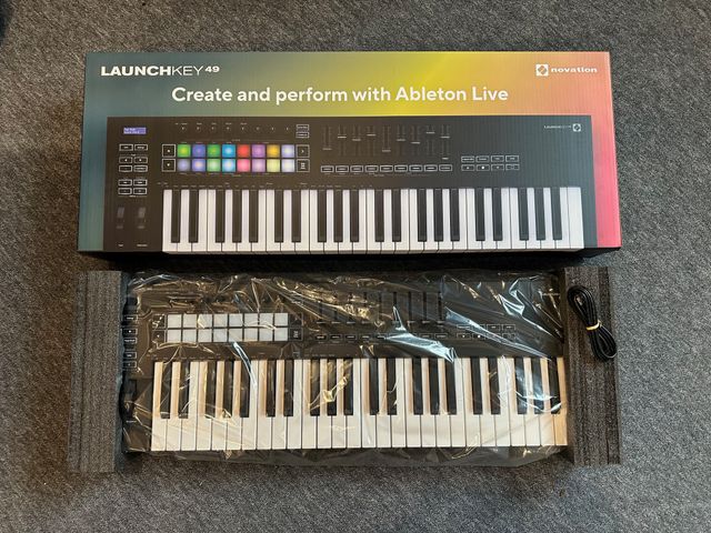 Detalles del productoVendo Novation Launchkey 49 MK3, un teclado controlador MIDI diseñado para Ableton Live, pero compatible con cualquier DAW. Con 49 teclas sensibles a la velocidad, 16 pads retroiluminados, 8 knobs y faders, es ideal para producción musical y directos. Funciona sin drivers en Mac y Windows. ¡Entrega en mano o envío disponible!