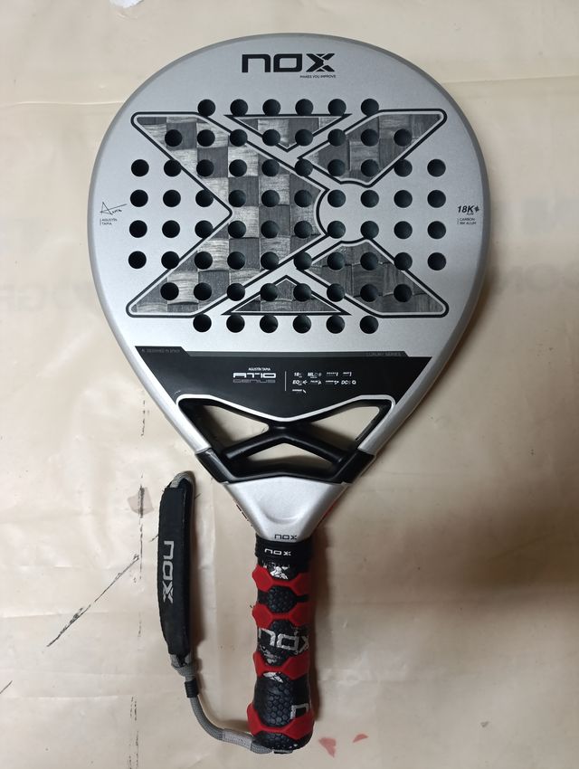 Detalles del productoPala de padel nox at10 18k, la pala de agustin tapia esta perfecta de goma, solo tiene algun roce del uso y pequeño defecto en la ultima foto no afecta a su uso!