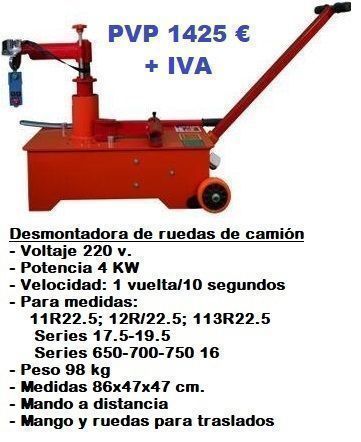 Detalles del productoNUEVA: Máquina desmontadora de ruedas de camión y autobús eléctrica. 230 v. Pequeña y práctica, con ruedas para moverla de un lado a otro fácilmente, como si fuera una transpaleta. Para llantas de 17.5" a 22,5". IVA NO INCLUIDO. También otro modelo de funcionamiento neumático y uno más que incluye equipo para destalonar. IVA NO INCLUIDO