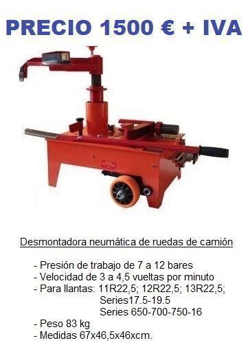 Detalles del productoNUEVA: Desmontadora de ruedas de camión neumática, funciona conectada a un compresor o al circuito neumático del camión. Tiene ruedas y mango para poderla desplazar como si fuera una transpaleta. Para llantas: 17,5" - 19,5" - 22,5". Varios adaptadores para diferentes tipos de llantas.Tamaño compacto para espacios reducidos o equipamiento de talleres móviles. IVA NO INCLUIDO. También disponible eléctrica a 220 v por 1.425 € + IVA