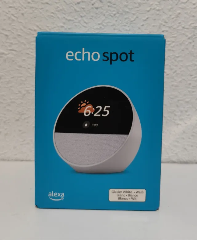 Detalles del productoDispositivo Echo Spot última generación con pantalla táctil y Alexa, color blanco.