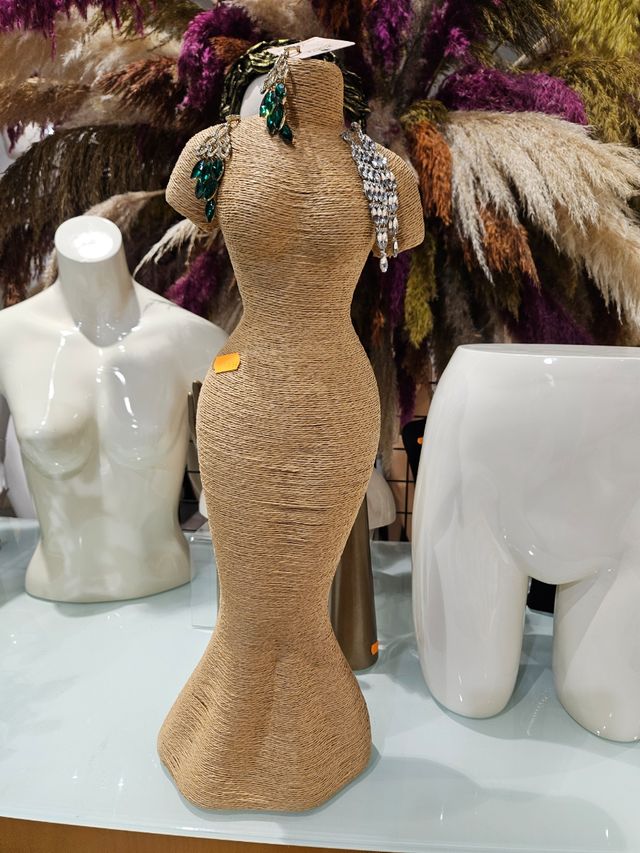 Expositor de complementos para collares, pañuelos, pendientes,etc....61 cm. de alto, forrado de rafia. Disponibles varias unidades.