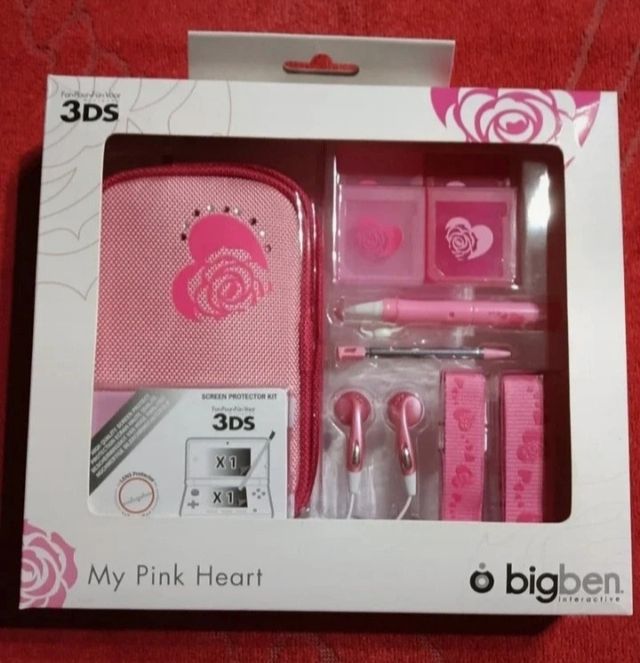 Detalles del productoPack Bigben My Pink Heart para Nintendo 3DS. Incluye una funda rosa con diseño de corazón y rosas, cuatro estuches para tarjetas de juego, lápiz táctil metal retráctil, lápiz grueso,