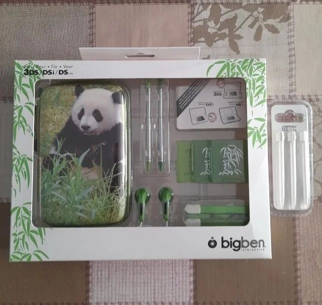 Detalles del producto•Pack para Nintendo 3DS, DS Lite y DSi. ¡A estrenar! Incluye funda con diseño de panda, 2 lápices táctiles, 3 estuches para juegos, películas protectoras, bolsa rígida de transporte y auriculares. Todo en perfecto estado.