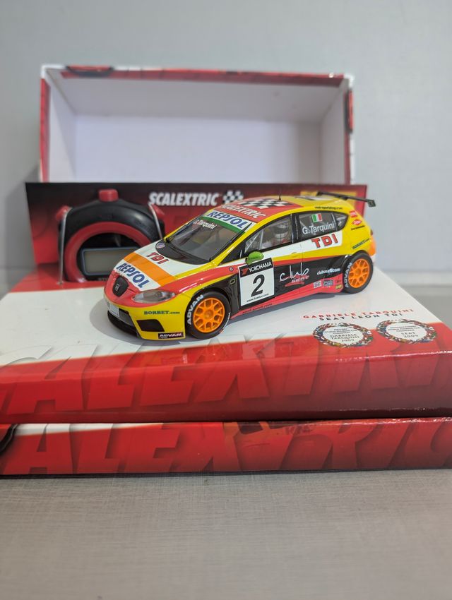 Detalles del productoCoche de slot a escala 1:32 de la marca Scalextric Tecnitoys, referencia 6479. Seat León 2.0 TDI #2, decoración oficial Repsol. Campeón del mundial de turismos (WTCC) de 2009, pilotado por el italiano Gabriele Tarquini. Válido para pistas de cualquier marca (fly, scalextric, scx, scaleauto, superslot, ninco, slot.it, policar, carrera, etc).