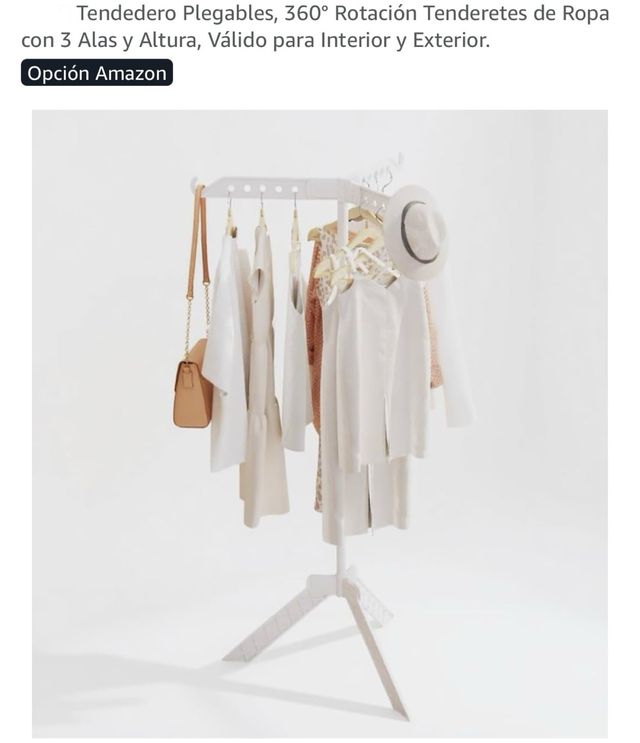 Tendedero plegable con 3 alas y rotación de 360 grados. Es apto para uso tanto en interiores como en exteriores.