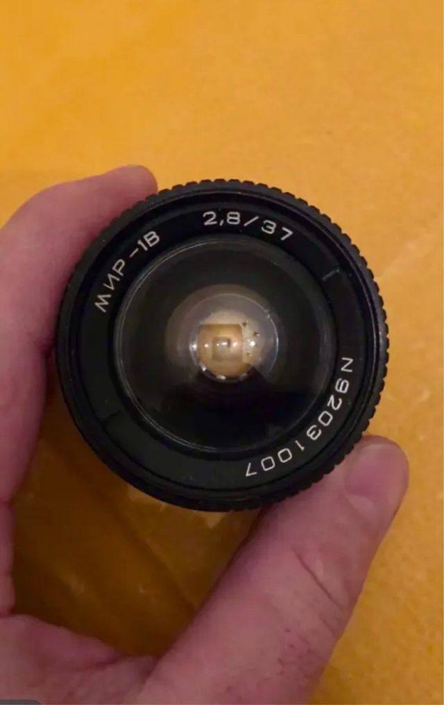 Detalles del productoObjetivo fotográfico Mir 1B con una apertura de 2.8 y una distancia focal de 37mm.