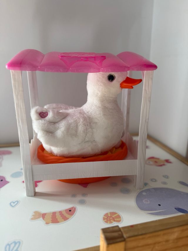 Los patitos se pegan a la oca con imán y va andando mientras la siguen los bebés patitos. Hace sonidos.