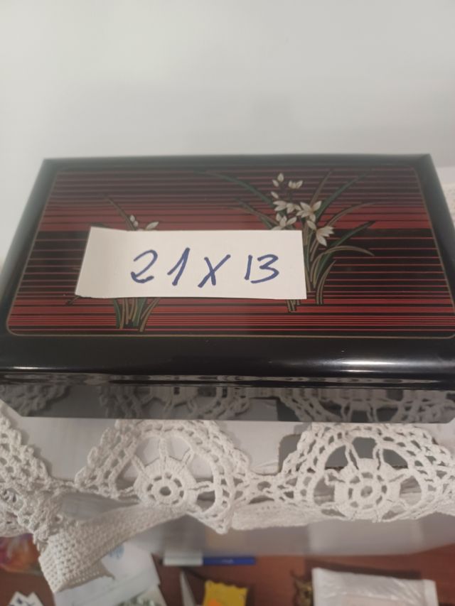 Detalles del productoElegante caja decorativa de madera lacada en negro con detalles en rojo y diseño floral. Ideal para guardar joyas, recuerdos u otros objetos pequeños.