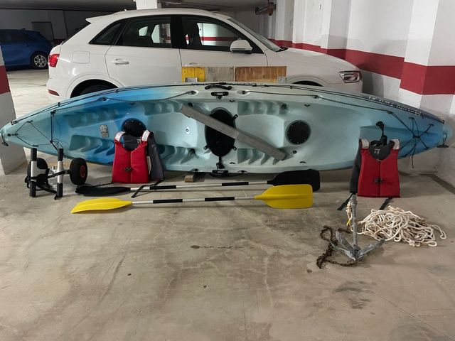 Detalles del productoSe vende kayak en buen estado, dos tambuchos mas departamento. Incluye dos chalecos salvavidas, dos remos, un carro de transporte y un ancla con cuerda. Incluye tambien el soporte al que se ve anclado en las fotos.