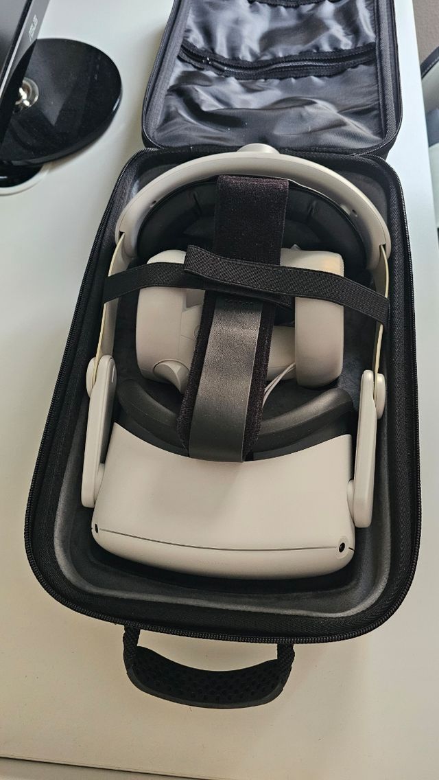 Detalles del productoOculus Meta Quest 2 de 128GB con caja original, bolsa rígida de transporte, fundas de silicosis para los mandos y soporte de cabeza ajustable con almohadilla.