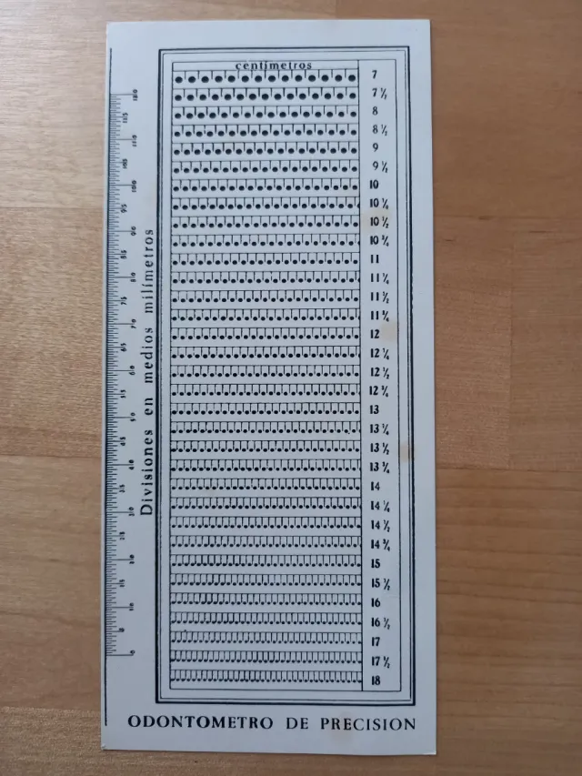 Herramienta de medición de precisión. Medidor del dentado de los sellos. - Escala en centímetros. - Divisiones en medios milímetros. - Rango de medición de 7 a 18 cm.