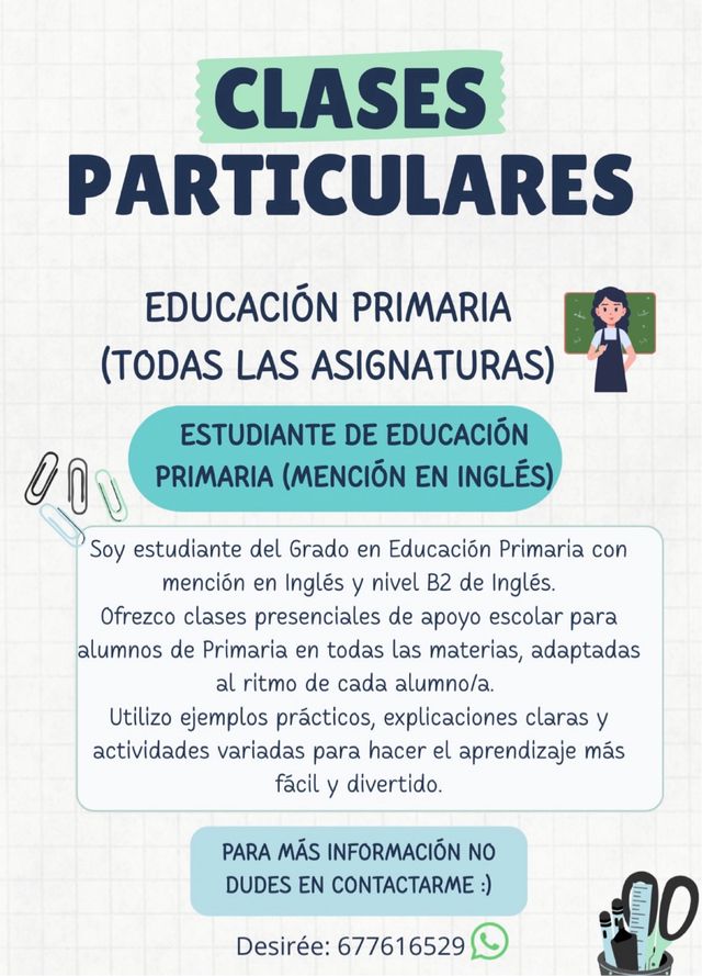 Ofrezco clases presenciales de apoyo escolar para alumnos de Primaria en todas las materias, adaptadas al ritmo de cada alumno/a.