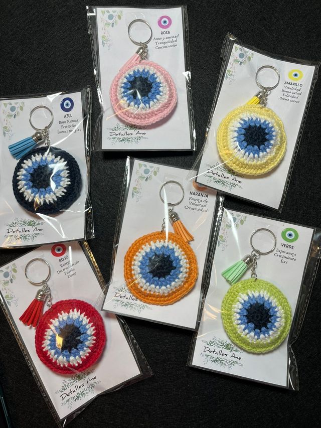 Llaveros de ojo turco hechos a crochet. Cada color con su significado.