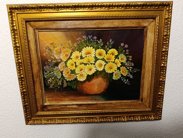 Precioso óleo sobre lienzo con marco dorado. MEDIDAS: 47x38 - Pintura de flores amarillas y moradas. - Marco con detalles ornamentales.