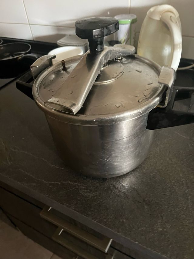 Detalles del productoOlla a presión de acero inoxidable, ideal para cocinar rápidamente. Es grande y está en buen estado, aunque muestra algunas señales de uso.